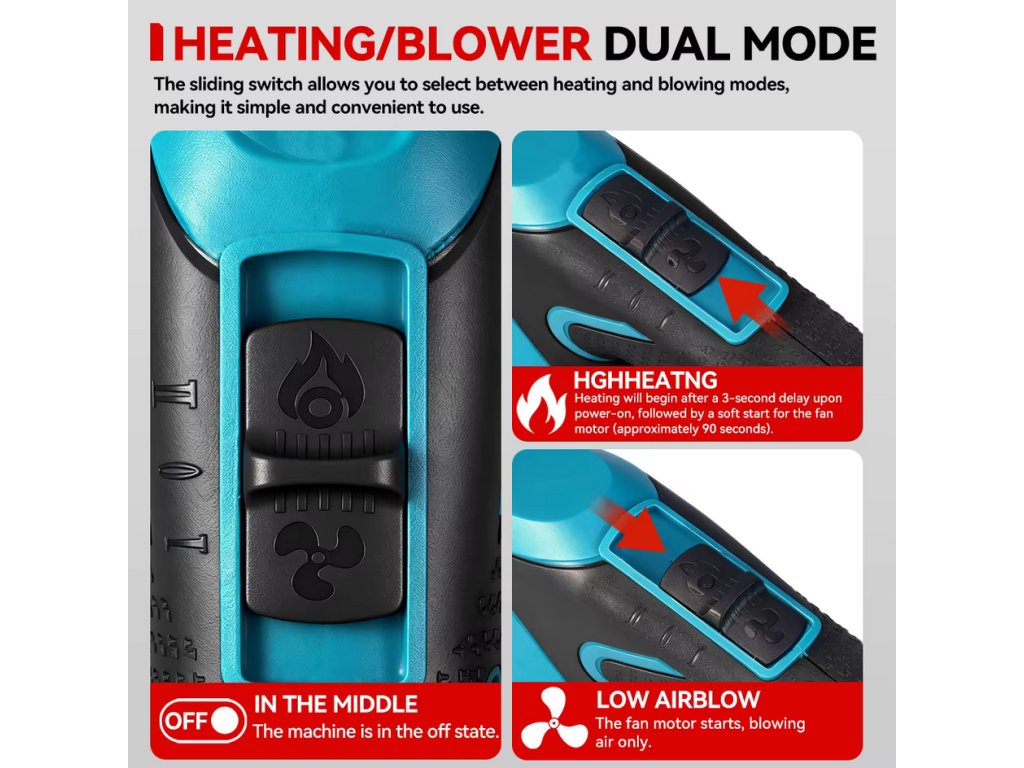 -Napájanie z batérie: Tento teplovzdušný stroj využíva na napájanie veľkokapacitnú nabíjateľnú lítiovú batériu, takže počas používania nebude viazaný káblom.