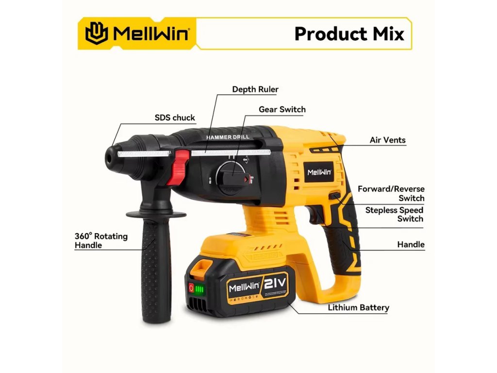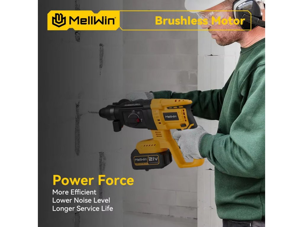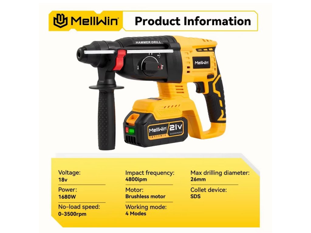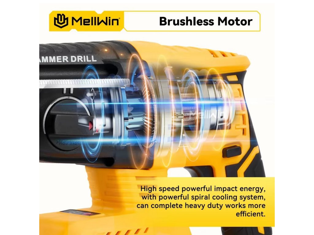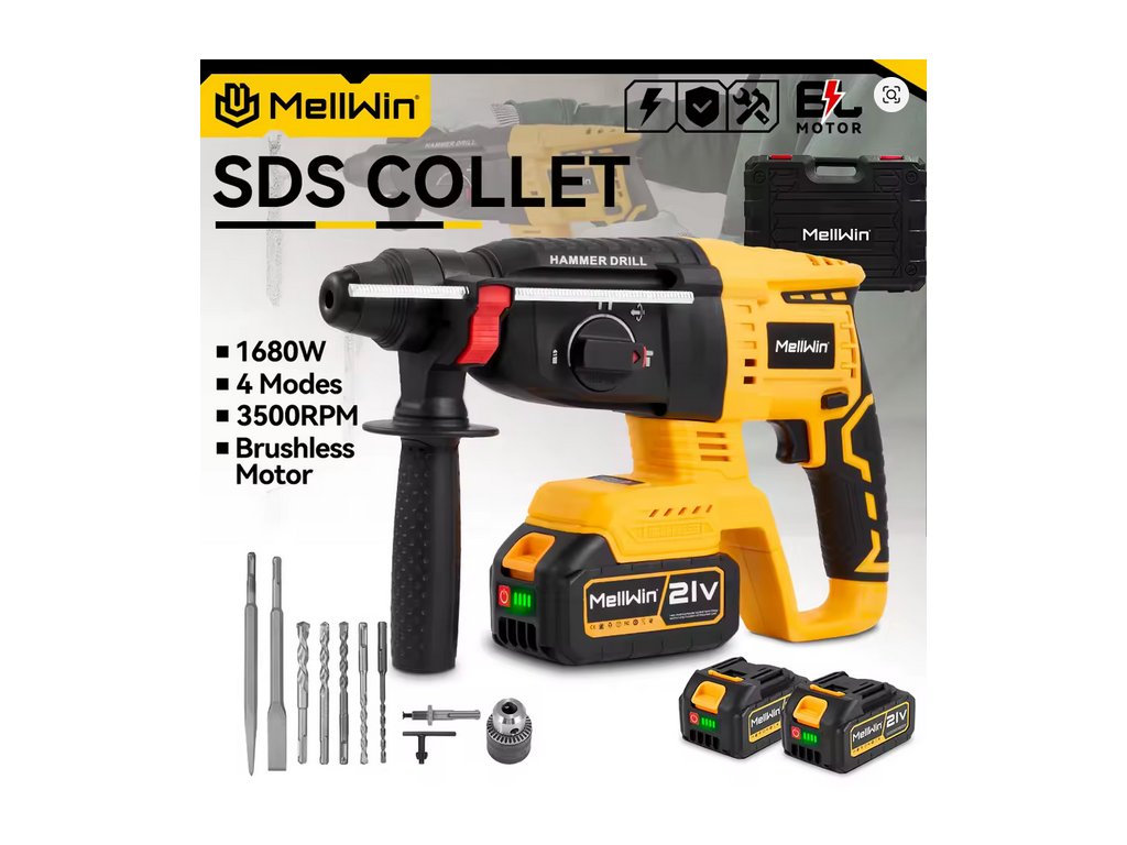 OneVan / Mellwin Bez uhlíkové elektrické vŕtacie príklepové kladivo, šramačka, príklepka pre batérie MAKITA 18V v kufíku 2 x batéria a nabíjačka