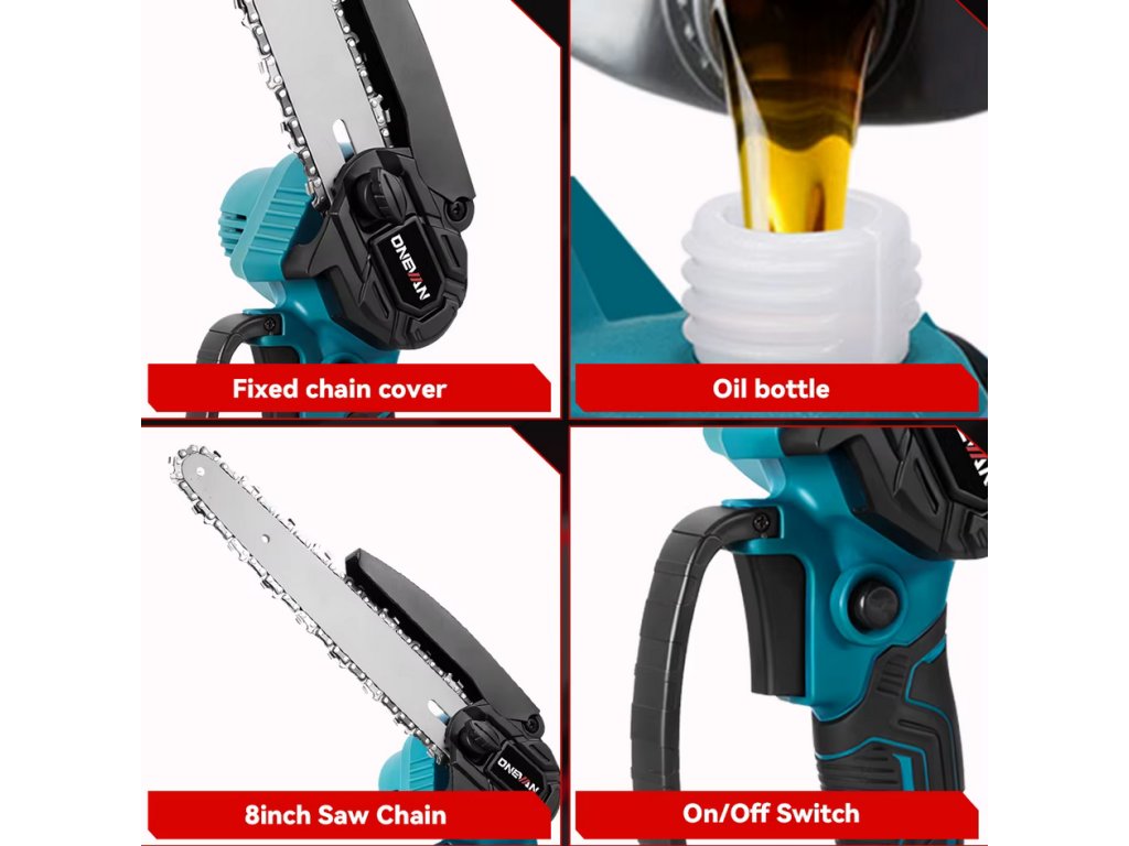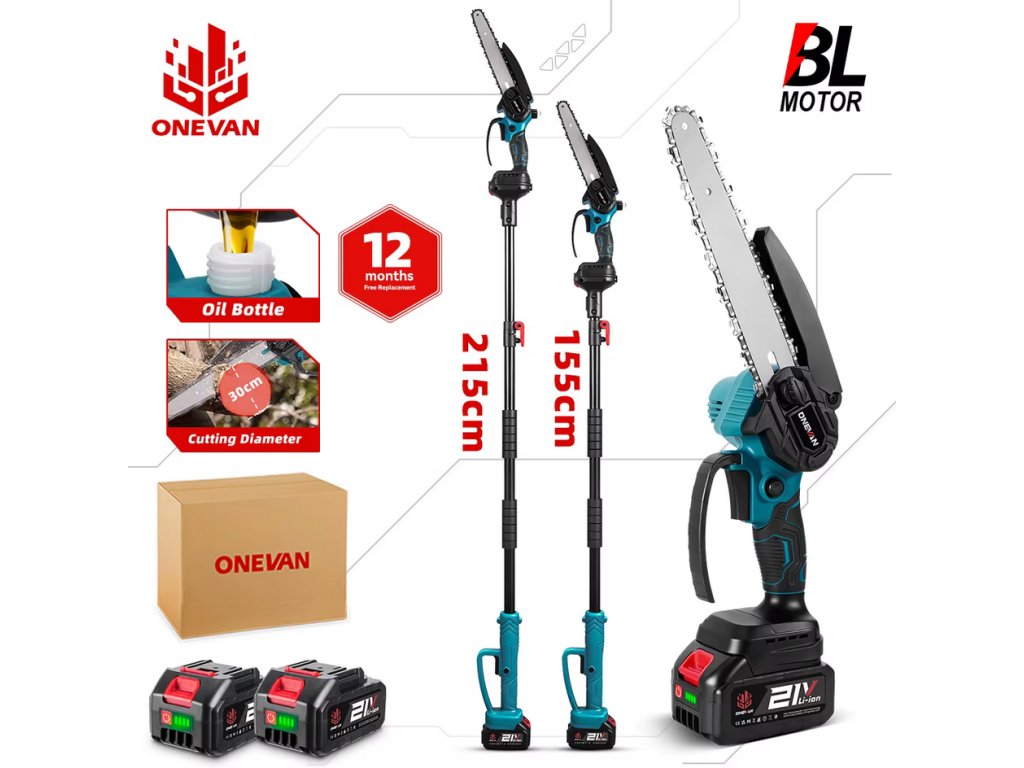 Súprava bezuhlíkovej teleskopickej píly s mazaním ONEVAN 2 x batérie 20 cm lišta dosah 215 cm + výška človeka. Vhodné pre batériu Makita 18V