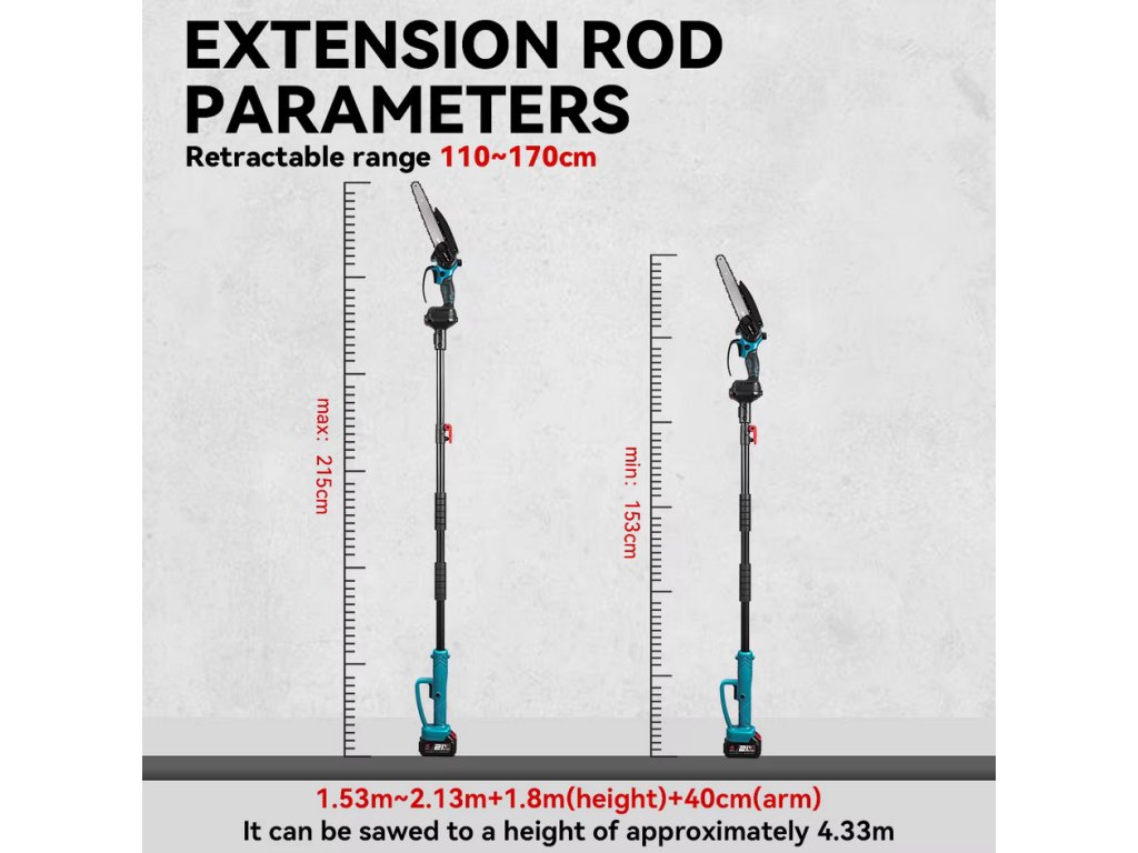 Predĺžený dosah až 1,7 metra bez píly – Odnímateľná predlžovacia tyč umožňuje bezpečne strihať vysoké konáre zo zeme, čím eliminuje potrebu rebríkov a zaisťuje maximálne pohodlie a kontrolu.