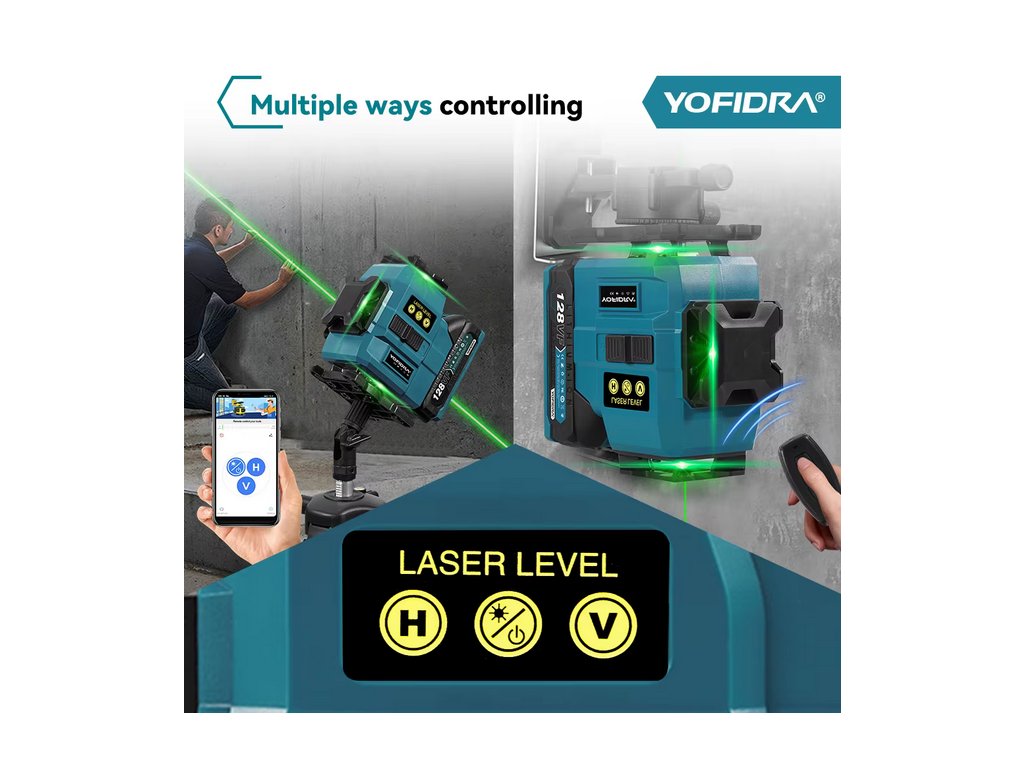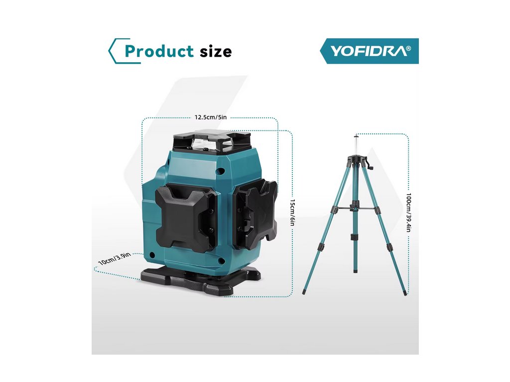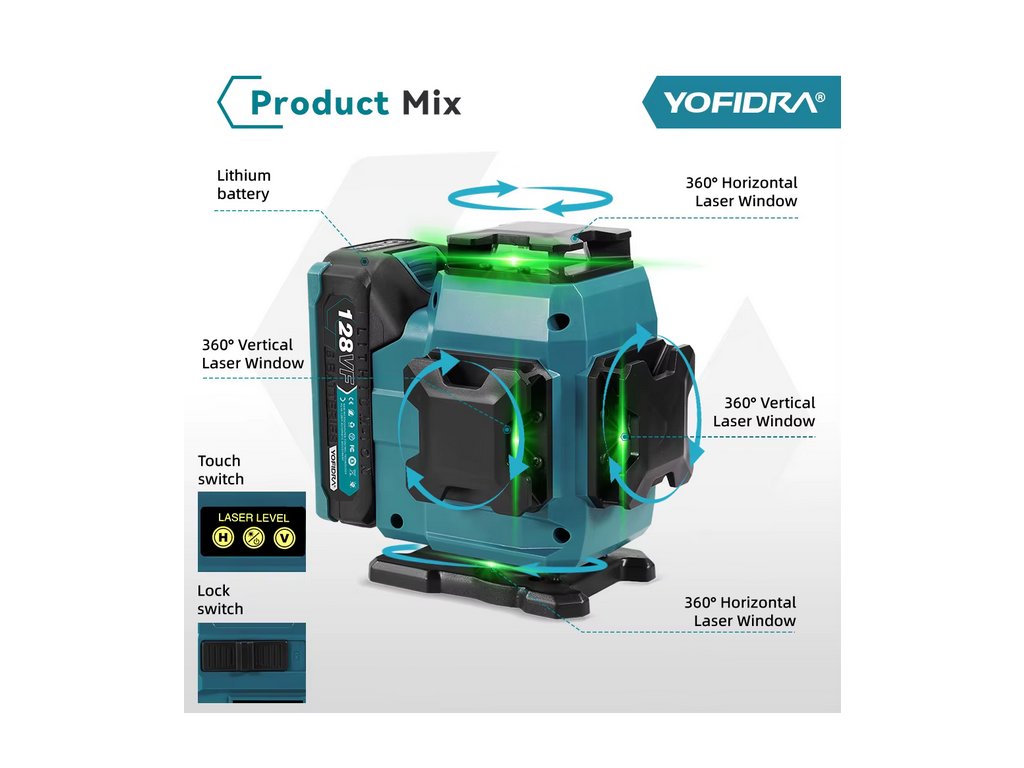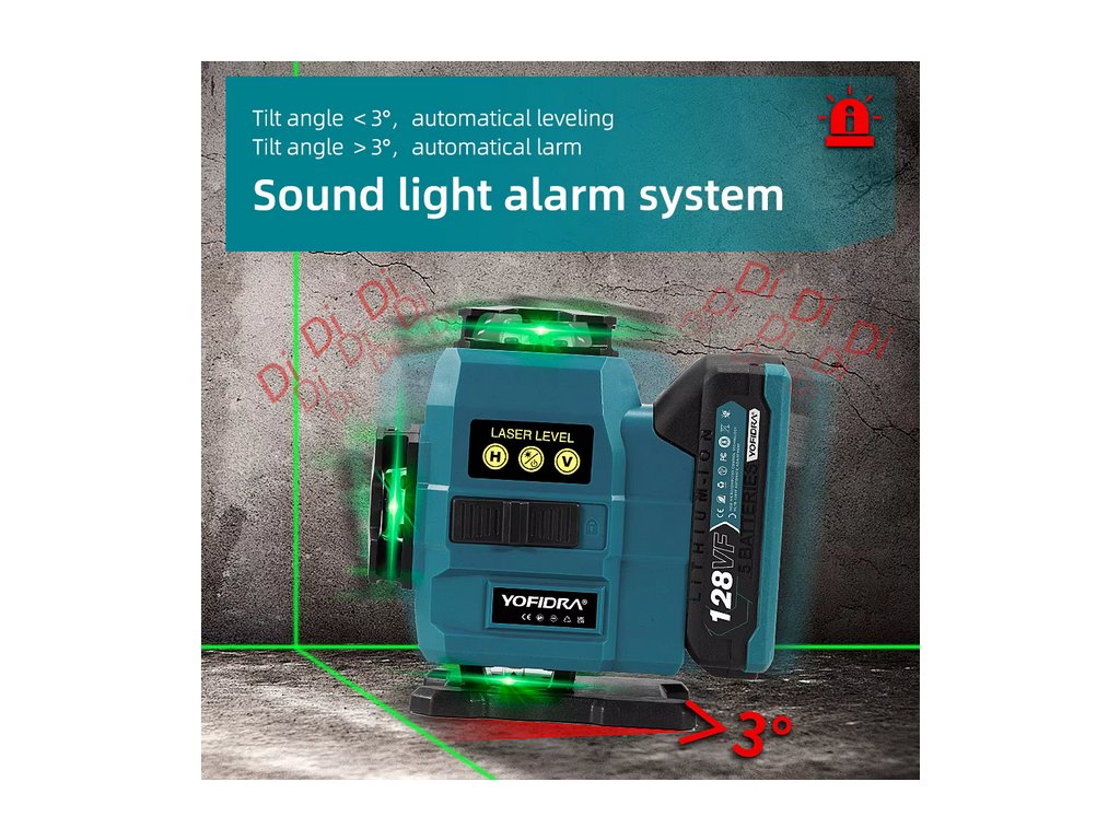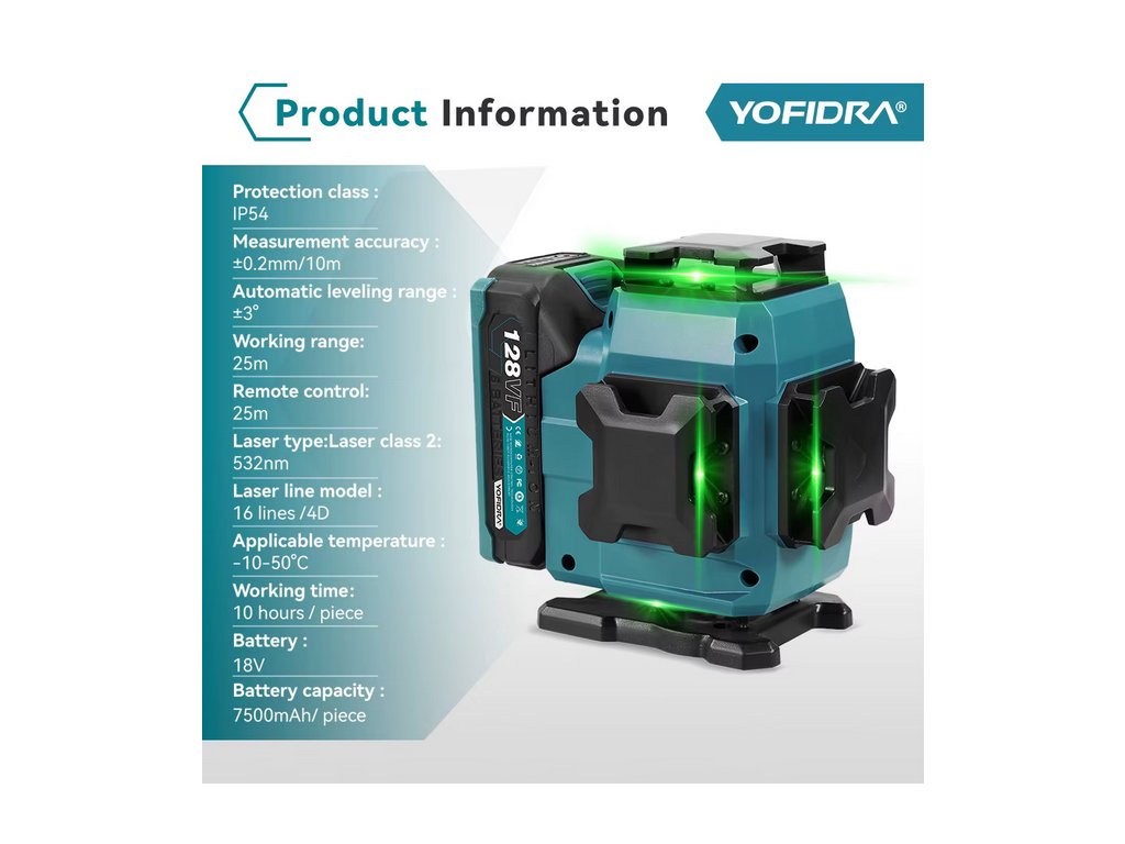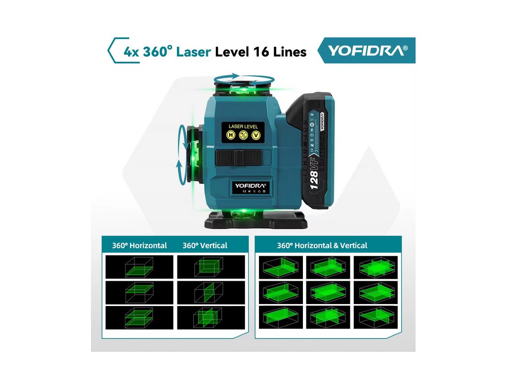 YOFIDRA 16 riadkov 4D laserová vodováha automatická 360° horizontálna vertikálna samonivelácia Ultra výkonný zelený lúč.Vhodný pre batériu MAKITA 18V