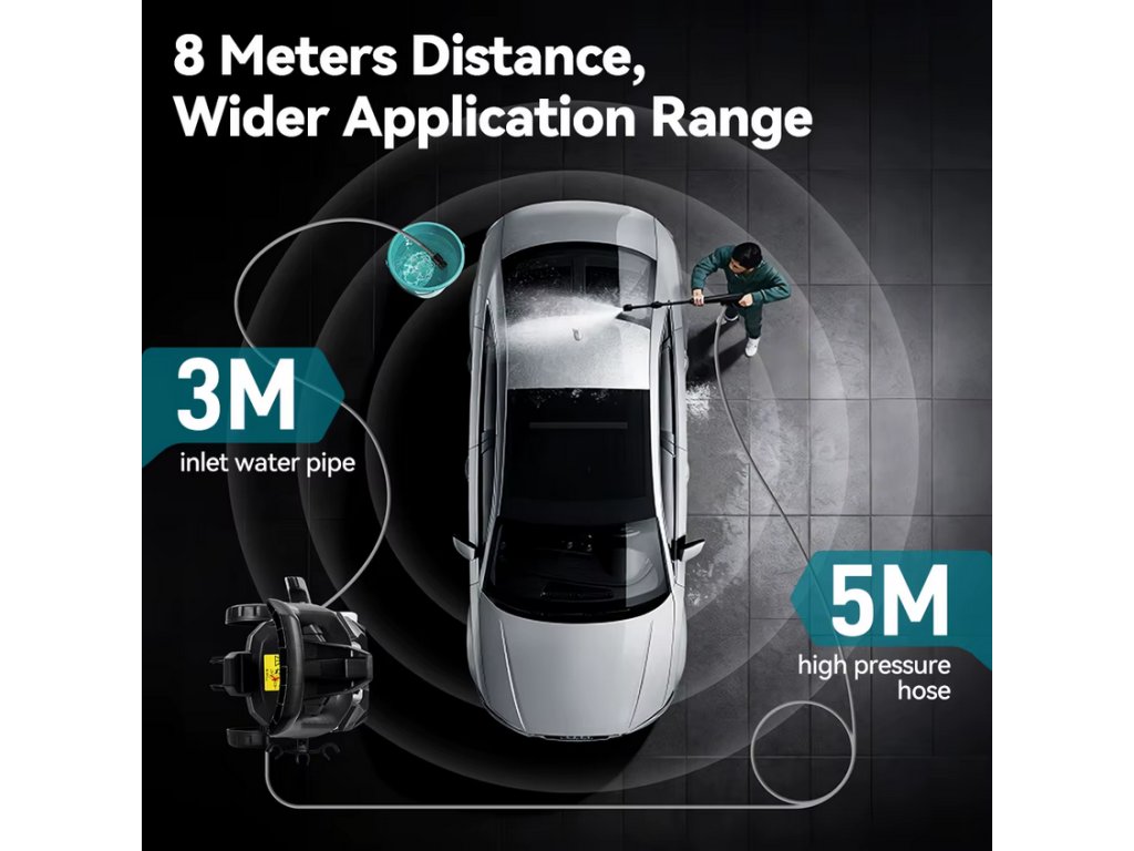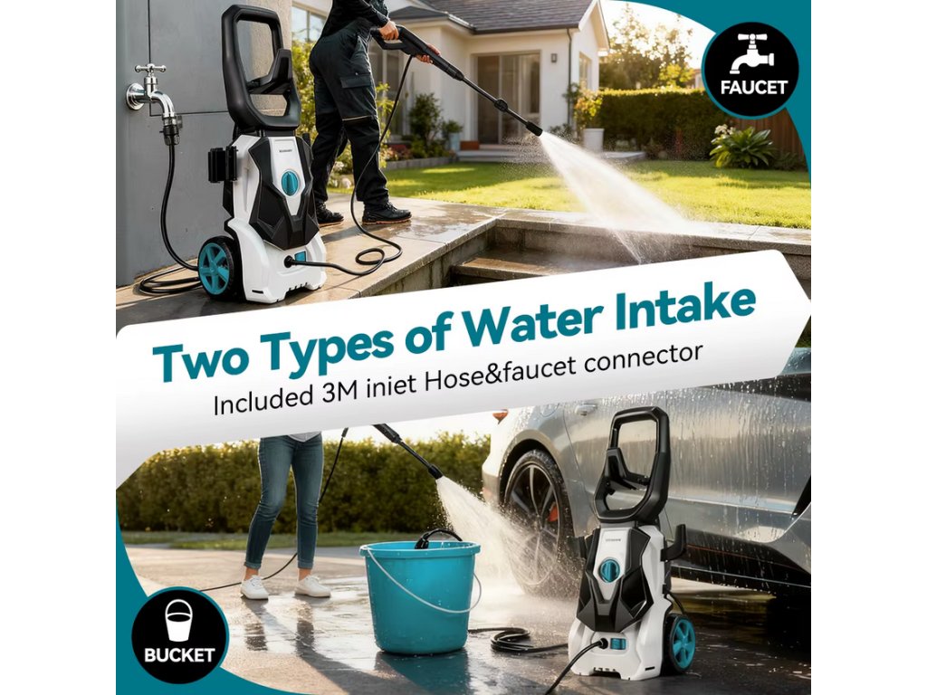 Nemáte vonkajší kohútik? Žiadny problém! Náš pokročilý samonasávací systém umožňuje stroju čerpať vodu priamo z vedra, nádrže alebo bazéna. V kombinácii s 3 m prívodnou hadicou a 5 m vysokotlakovou hadicou máte maximálnu flexibilitu čistiť kdekoľvek a kedykoľvek.
